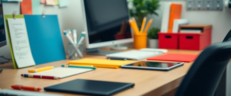Modern workspace with computer, supplies and decorations. 3d rendering.