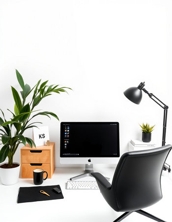 Modern workspace with computer, supplies, coffee cup and plant on white background