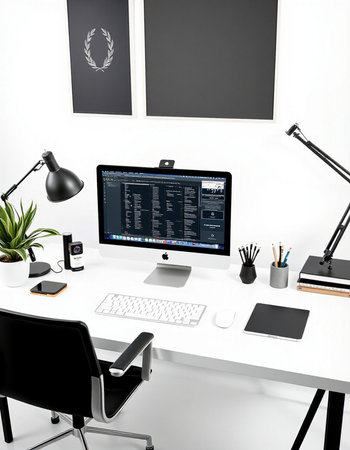 Modern workplace with computer, lamp and other objects. Workplace concept
