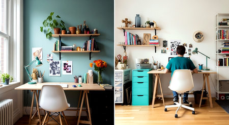An inviting home office filled with natural light, showcasing smart storage solutions and minimalist design elements that inspire creativity and enhance focus.