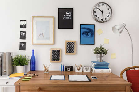Large, framed portrait photo and a monstera plant in a classic workspace interior with an orange lamp on a wooden desk