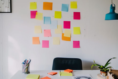 A cluttered desk filled with colorful sticky notes, A bulletin board filled with sticky notes and study tips