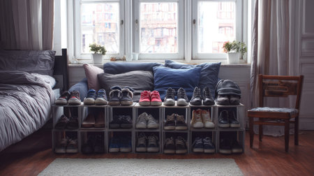 Bright and inviting bedroom scene showcasing an organized shoe rack, comfortable seating, and plenty of natural light filtering through the windows.