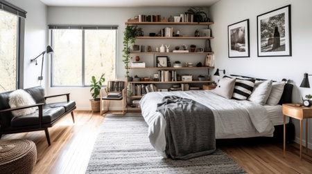 Bedroom decor, home interior design . Modern Scandinavian style with Bookshelf decorated with Wood and Metal material . Generative AI AIG26.