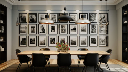 Interior design of Dining Room in Modern style with Statement chandelier decorated with Leather dining chairs, patterned rug material. Industrial architecture. Generative AI AIG24.