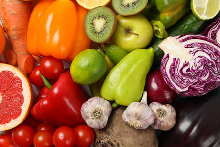 Different vegetables and fruits background, top view