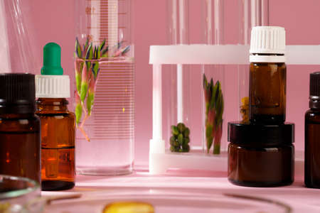 Scientific glassware, Beaker and cylinder, Natural organic skincare cosmetic beauty products, Research and development concept.