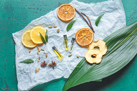 Perfume samples on color background