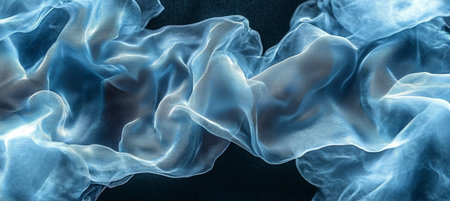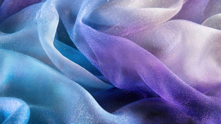 An abstract composition features flowing fabric in shades of blue and purple. The translucent material creates a sense of movement and depth against a light background. This artwork showcases soft textures and dynamic lines suitable for various visual projects and design applications.