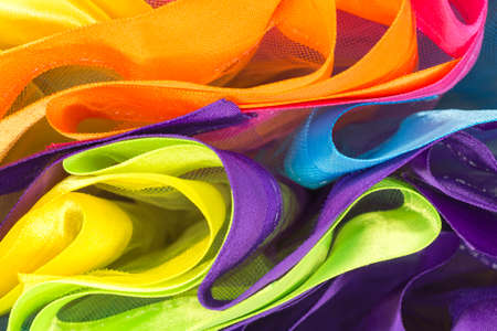 A colorful piece of fabric with a rainbow pattern. The colors are vibrant and the fabric appears to be flowing