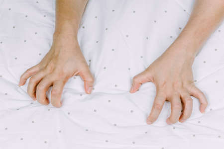 Woman hands on the bed clutching the sheet. Hands of woman clutches grasps a white crumpled bed sheet in a hotel room. Close up hands woman on bed, female pulling white sheet, sexual feeling concept