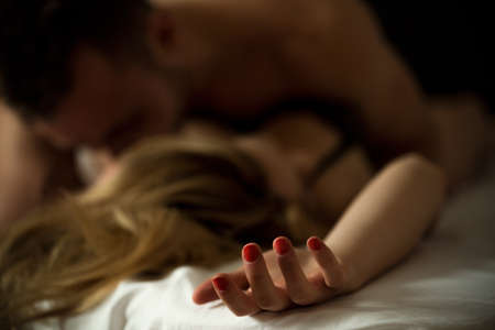 View on hands of passionate sexy couple. Romantic couple in bed enjoying sensual foreplay.