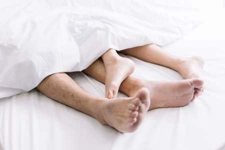 Close up of couple feet sleeping together on bedroom at early morning. Couple relaxing concept.