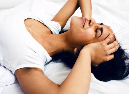 pretty brunette indian woman in bed, cant sleep, lifestyle real modern people close up