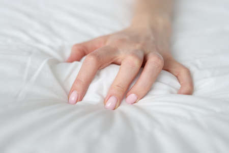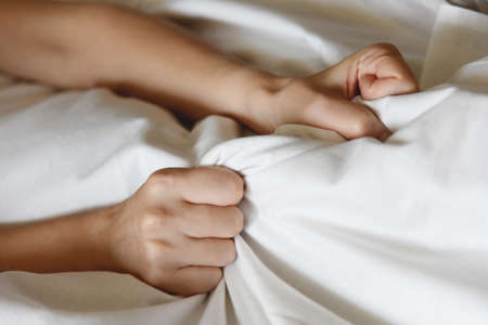 Concept of sexual relations,Close up of hand woman sign orgasm,Finger female pulling white bedsheet,Selective focus
