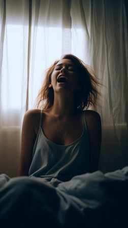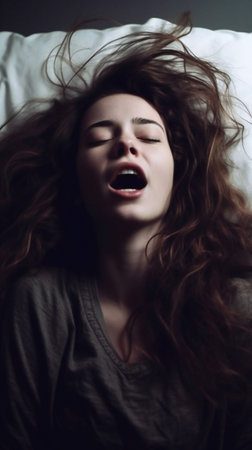 A female lies in a dark bedroom moaning with her mouth agape. Ai generated