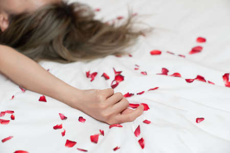 Women hand pulling or grasping white sheets. Hand sign orgasm of woman on white bed sheet with rose petals.