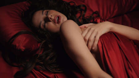Young European woman having orgasm. Beautiful woman with open mouth and closed eyes enjoying sex lying on the bed. Red silk. Sexual experience, masturbation, cunnilingus