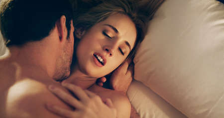 Affectionate young woman kissing man. Sensual and romantic young couple kissing and making love on the bed at home in the morning. Close-up of happy couple is lying in bed together. Enjoying love
