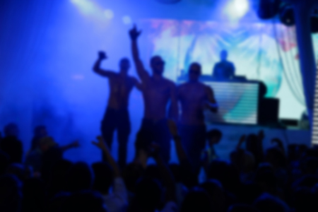 Blurry night club dj party people enjoy of music dancing sound with colorful light.