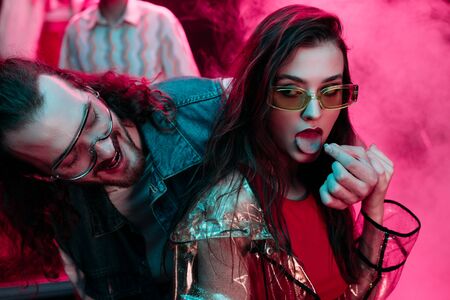 man putting on tongue of woman lsd pill in nightclub