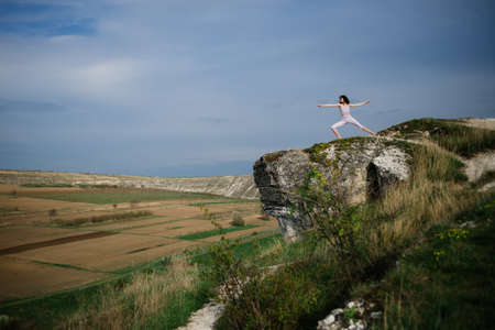 Young woman doing complex Yoga exercise on a rock