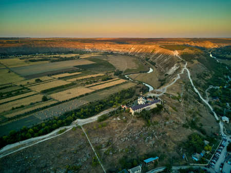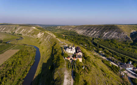 Republic of Moldova Old Orhei Monastery and Butuceni Village aerial view at sunrise