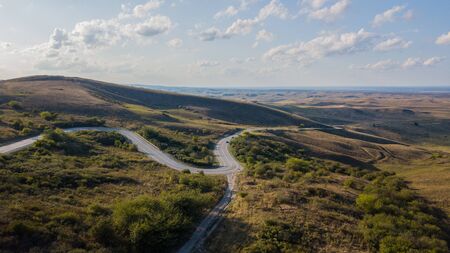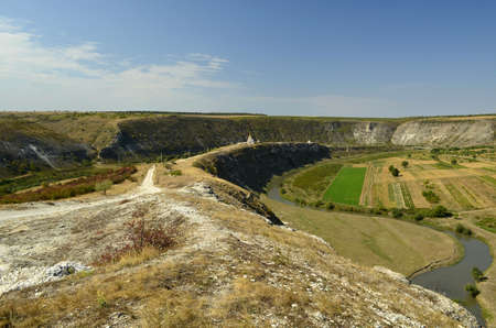 Beautiful landsaft of rocky hills that is crossed by a meandering river. Sunny day with blue sky with white clouds. Raut River, Old Orhei, Moldova.