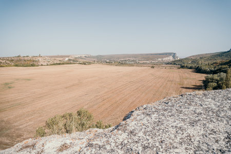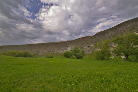 Incredibly beautiful landscape view from the mountain of Klimentyev, Crimea, to the valley before a thunderstorm in spring.