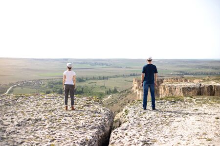 Woman and man in social distancing standing outdoors on the rock.