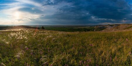 Spring landscape with wild flowers in steppe and clouds in sky. Floral meadow with grass, panorama, lowland