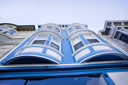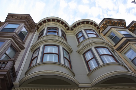 Traditional San Francisco, California Victorian style bay windows. Low angle view.