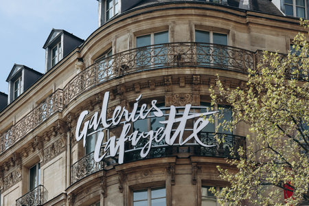 Paris, France - 16 April 2023: Galeries Lafayette sign on the facade of the famous department store in Paris