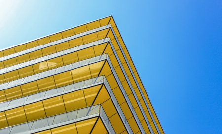 A low-angle shot of a modern building with a glass facade, showcasing the geometric patterns of the windows against a bright blue sky.