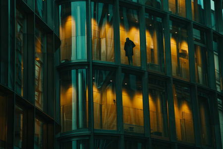 Modern office building windows lit in evening night early morning long working hours exhaustion overtime exterior urban architecture skyscraper lights tower financial sector banking hq headquarters