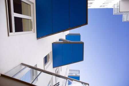 Modern apartment building on a background of blue sky. Architectural detail.