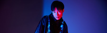 A handsome asian man showcases his unique style with vibrant lighting in an artistic setting.