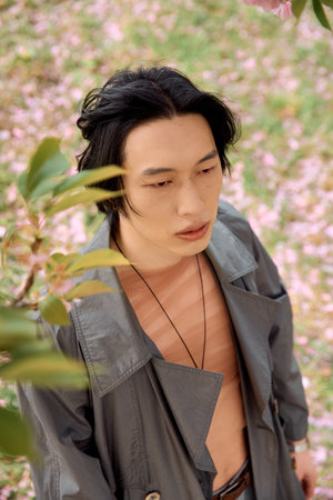 A young Asian man enjoys a peaceful moment in a park, surrounded by blooming flowers.