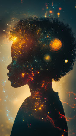 A child's silhouette glows with colorful celestial patterns and cosmic elements, symbolizing the essence of curiosity and creativity, engaging viewers in a dreamy exploration of the universe.