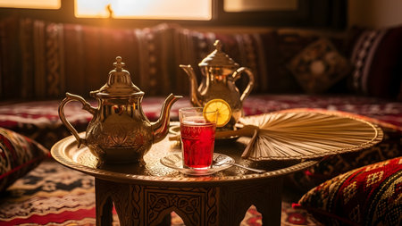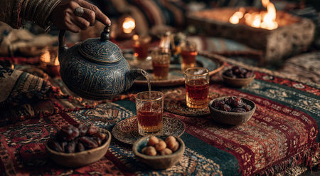 Ornate teapot pours tea into glass cups, surrounded by dates and nuts on a vibrant textile, evoking a cozy and inviting ambiance of cultural tradition