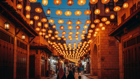 Festive street with glowing lanterns at dusk