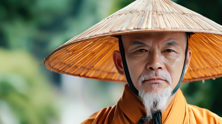 A detailed shot of an older Asian man with a white goatee and a traditional conical straw hat, looking directly at the camera with a solemn expression.