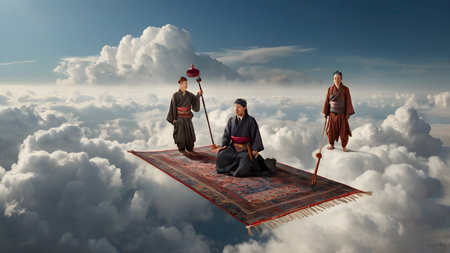 magic flying carpet in the sky between clouds