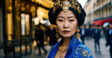 60 year old Asian female model in Paris Fashion Week. ai generative.