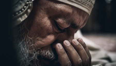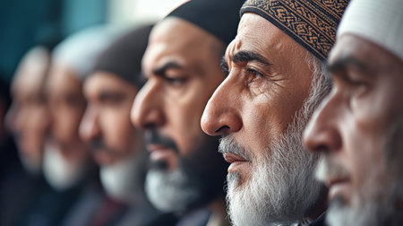 Group of Muslim men in traditional clothes praying together at the mosque.