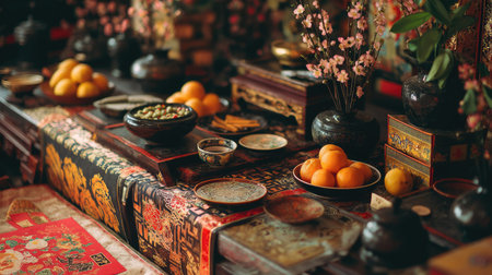 This vibrant image showcases a traditional Asian table setting, adorned with food, floral arrangements, and decorative items, reflecting cultural heritage.