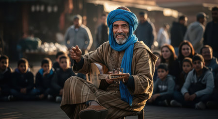 Mature hispanic male musician performing outdoors in traditional attire