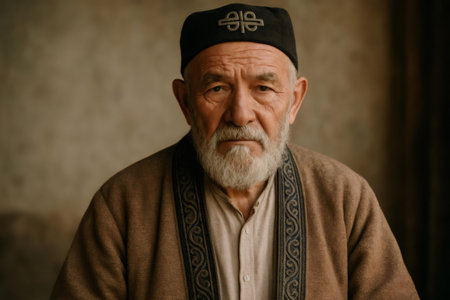 Elderly Kyrgyz man wearing traditional cap and patterned sweater, representing rich cultural heritage