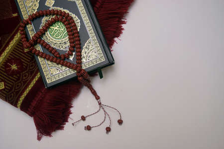 Holy Quran with prayer beads and prayer mat on white background