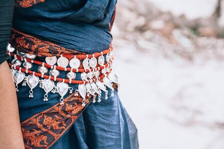 classic Indian Odissi dance costume with belt decoration. close up, copy space. classical Indian culture and traditions. Odissi dancer